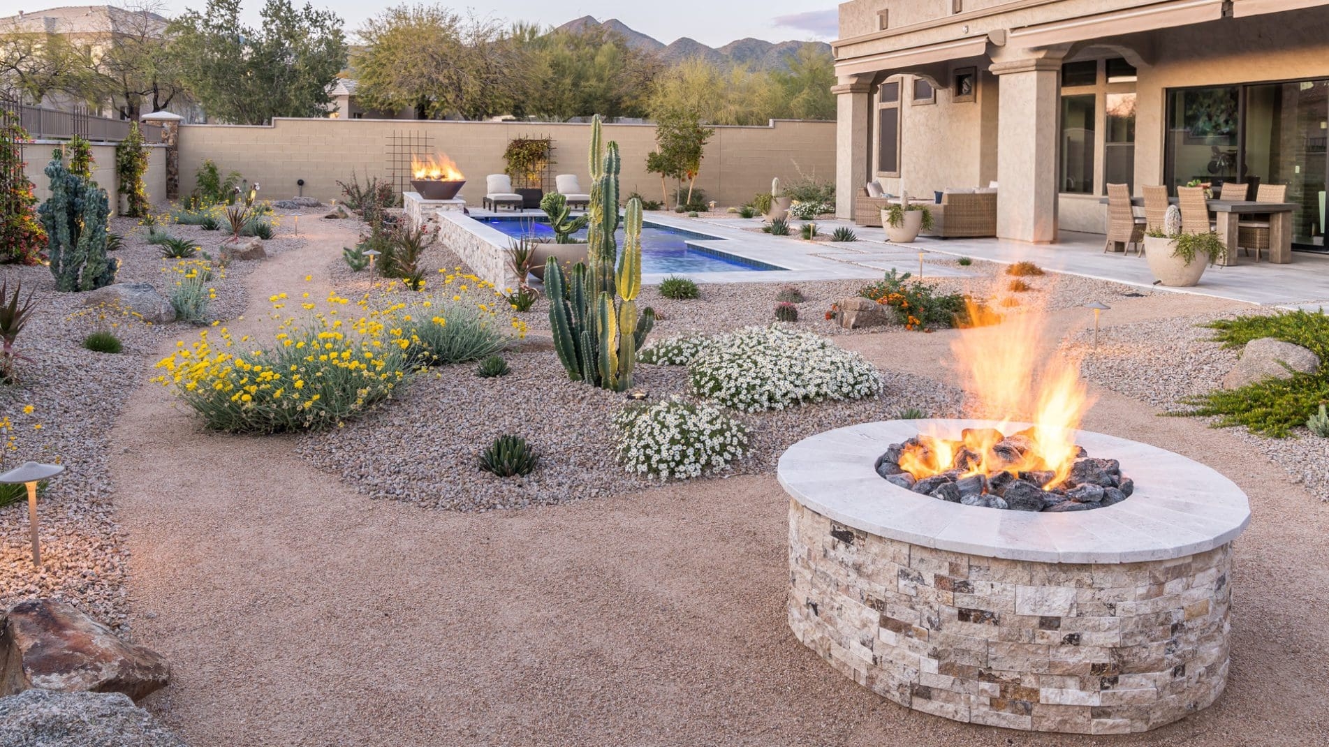 When it comes to garden landscaping ideas, think about incorporating native plants that are drought-tolerant and require minimal water. Consider adding outdoor features like a water-efficient irrigation system, a cozy seating area, or a fire pit for those cool desert evenings.