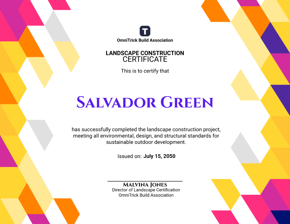 Free Colorful Landscape Construction Certificate Template To Edit Online